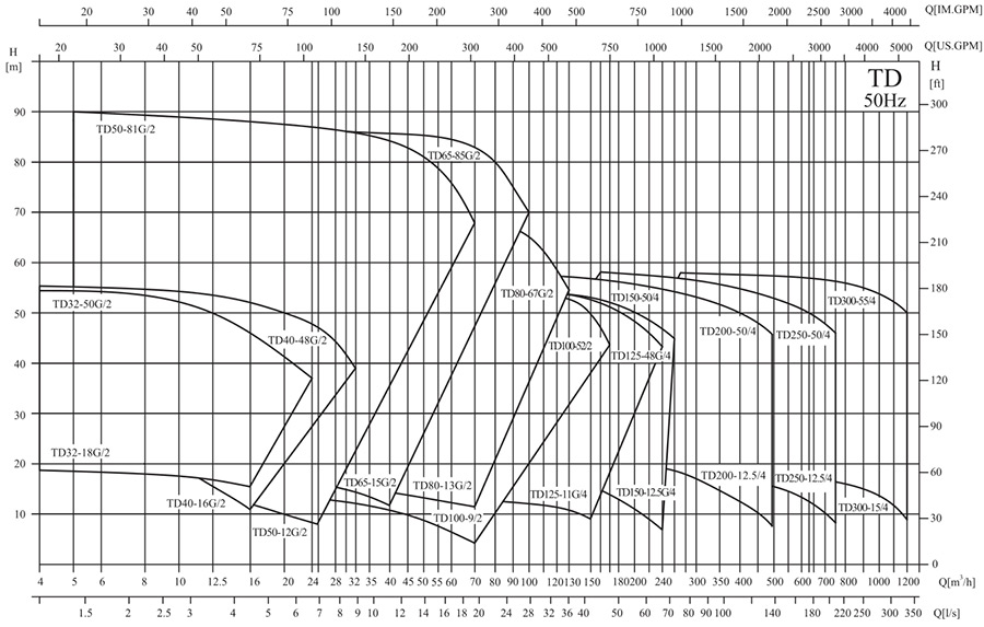 4、泵的使用參照加粗曲線的性能范圍,以防流量過小產(chǎn)生過熱和流量過大使電機(jī)過載等;