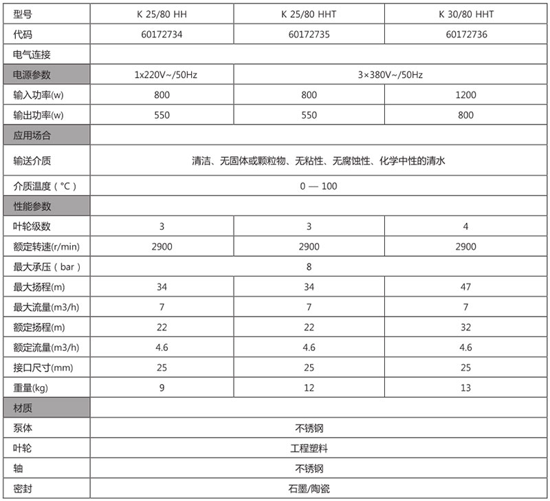 產品特點 AISI304不銹鋼泵體、端蓋及轉子軸、外觀美觀,使用壽命長;接線盒防護等級IP55,電機防護等級IP44,絕緣等級F;帶有埋入式熱保護器和啟動電容,運行噪音低;多級葉輪,高揚程,24月保修期;
