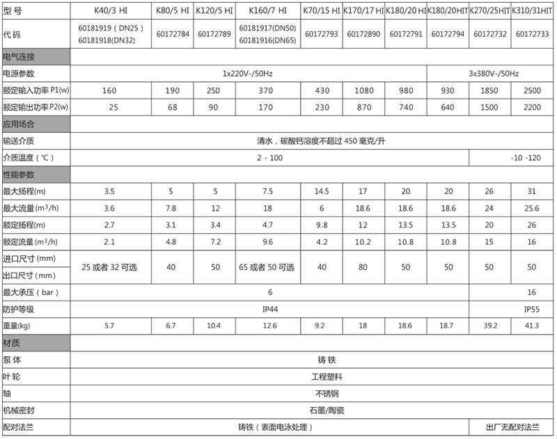 感應(yīng)電機(jī)感應(yīng)電機(jī),結(jié)構(gòu)緊湊,風(fēng)扇自冷,自潤滑密封軸承,噪音低,壽命長,單相帶有埋入式熱保護(hù)器和啟動電容,三相電機(jī)能效符合IE2標(biāo)準(zhǔn),效率高;帶有熱保護(hù)器和啟動電容,電機(jī)能效等級高;泵體、支架和法蘭表面電 泳處理,防腐性能高,水力性能優(yōu),符合CCC標(biāo)準(zhǔn)(K270/25HIT,K310/31HIT未包含),24個月的保修期。